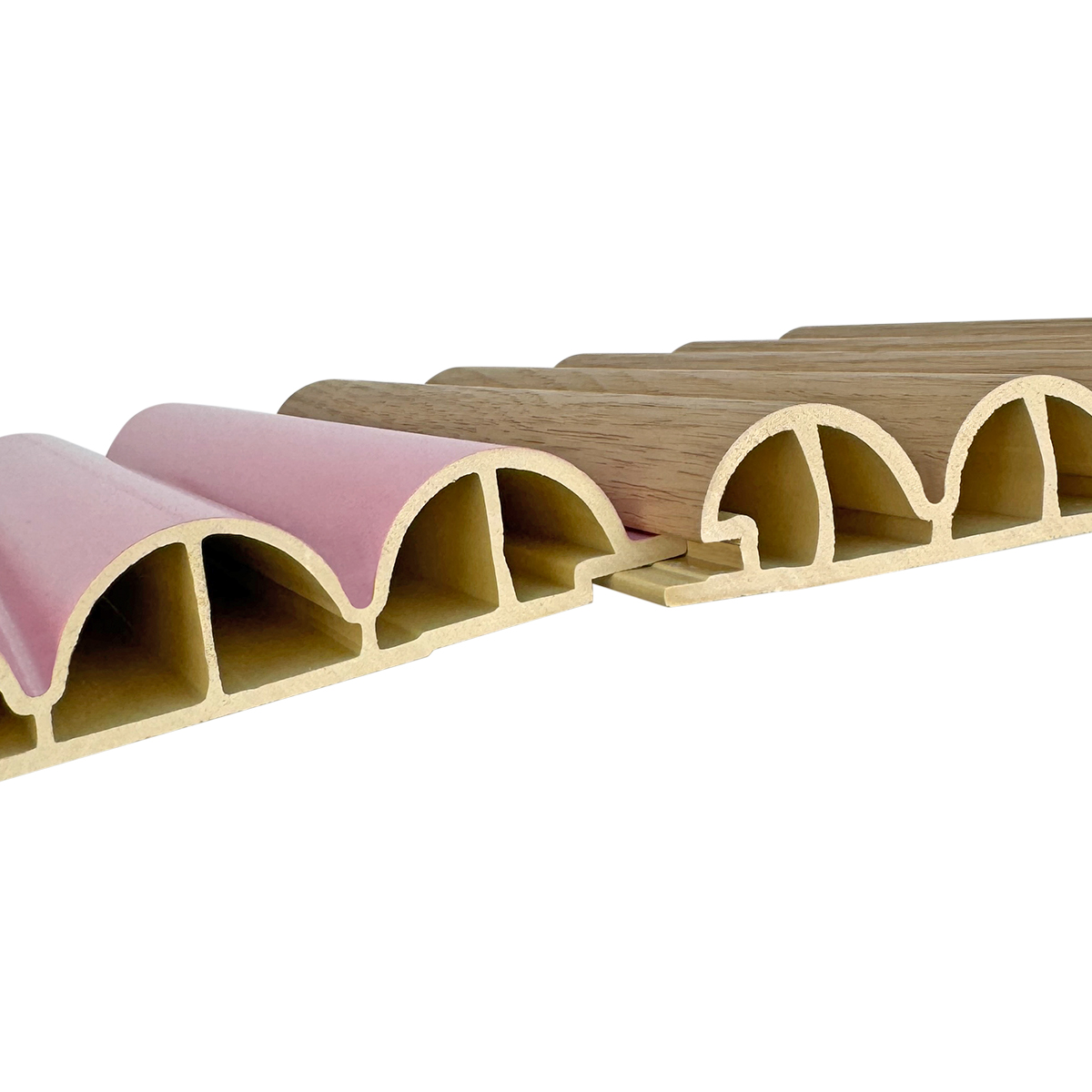 Indoor WPC 180 Five Semicircular Fluted Panels offer a flexible solution for interior decoration that combines functionality and design with a practical aesthetic at its core. The panels are made of environmentally friendly wood-plastic composite material, combining thermal, moisture and acoustic properties to meet the different needs of walls and ceilings. The unique groove structure and natural wood grain surface not only enhance the three-dimensional sense of space, but also simplify daily cleaning and maintenance, which is suitable for the pursuit of quality home and commercial space.